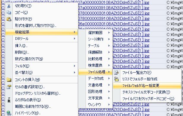 ③、Excelシート上にて右クリックして、機能拡張⇒ファイル処理⇒「ファイル/フォルダ名一括変更」をクリックします。